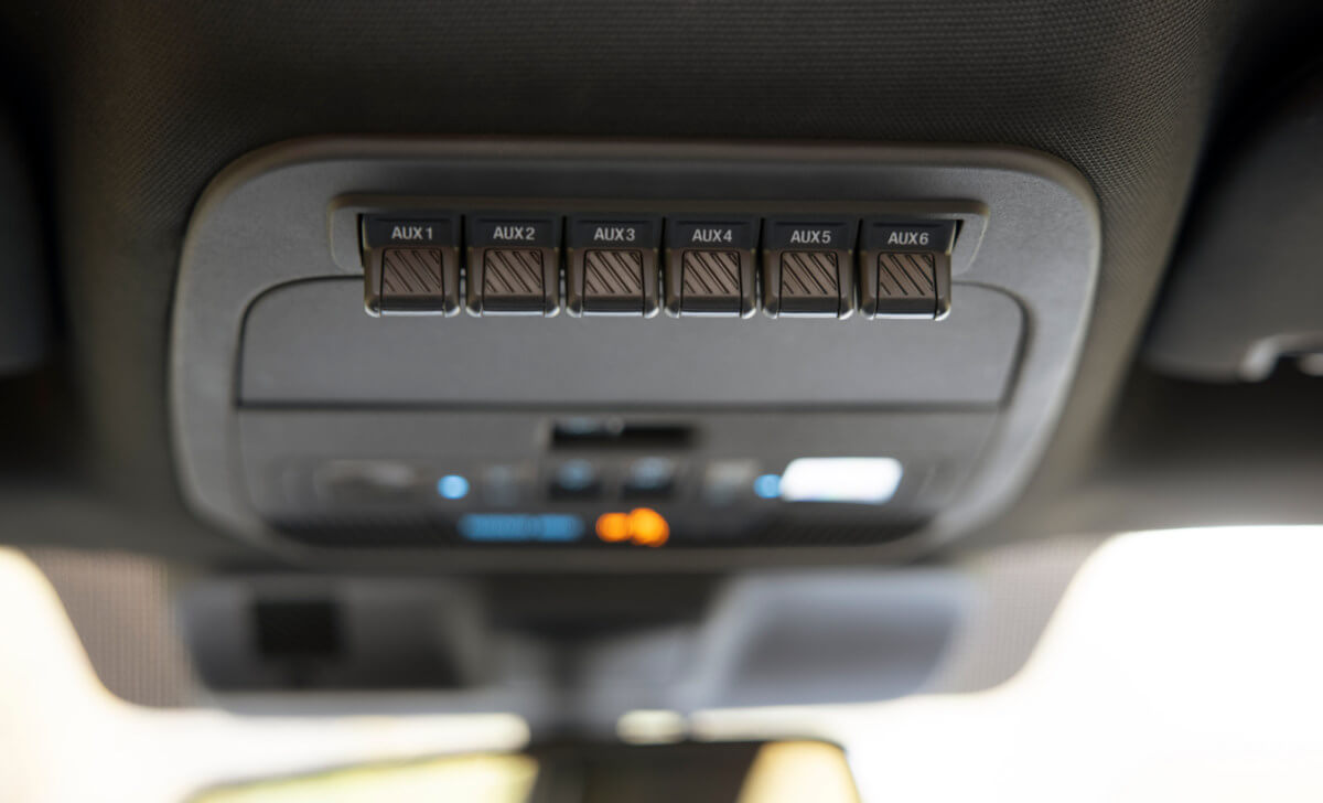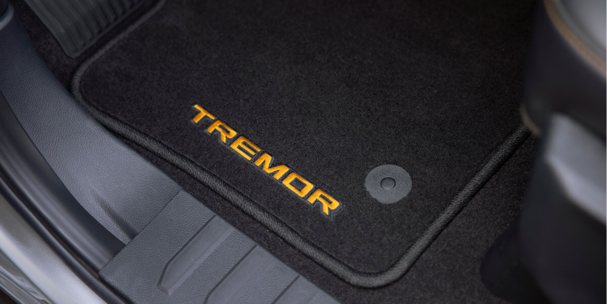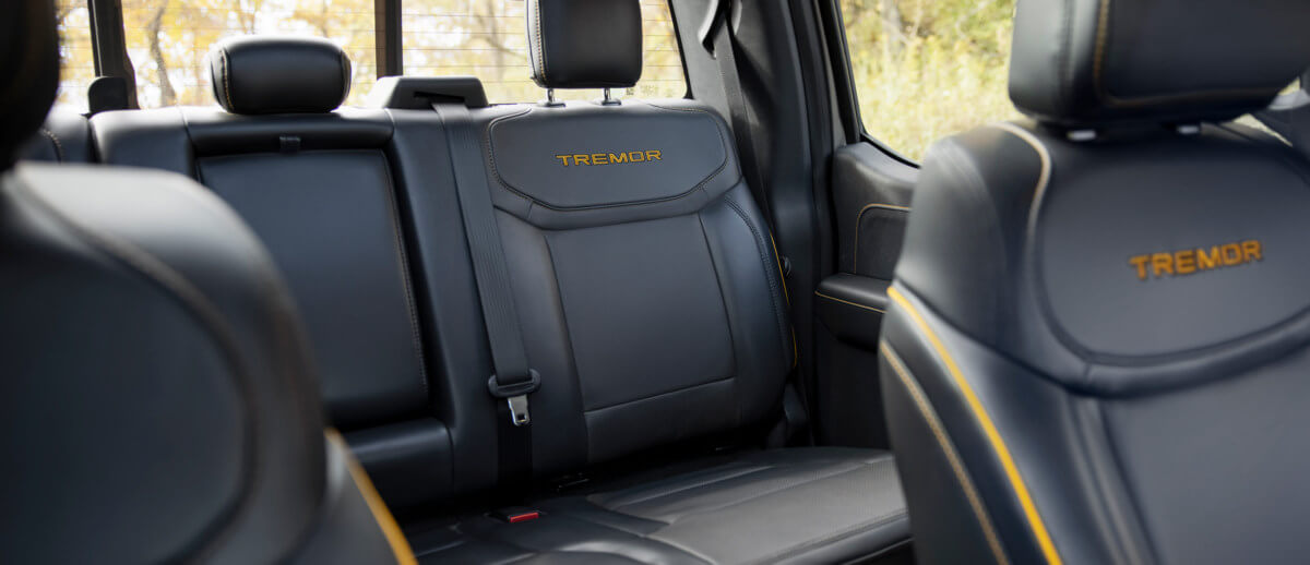 On the inside, the Orange accents are carried over as stitching on the seats, floor mats, instrument panel, center console, and doors. There is a laser-etched American flag on the dashboard ends. The Tremor has three levels with different equipment, and the top two grades have a dual 12-inch horizontal infotainment touchscreen and gauge cluster. The Tremor also comes with 6 auxiliary switches for integrating custom accessories such as light bars, winches, etc.