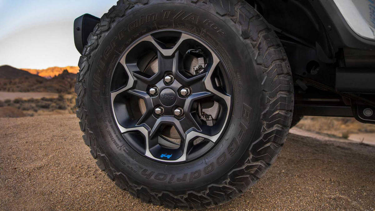 The Rubicon 4xe is available in ten different colors with 17″ off-road wheels and 33″ tires. However, the other two variants feature 20-inch wheels.
