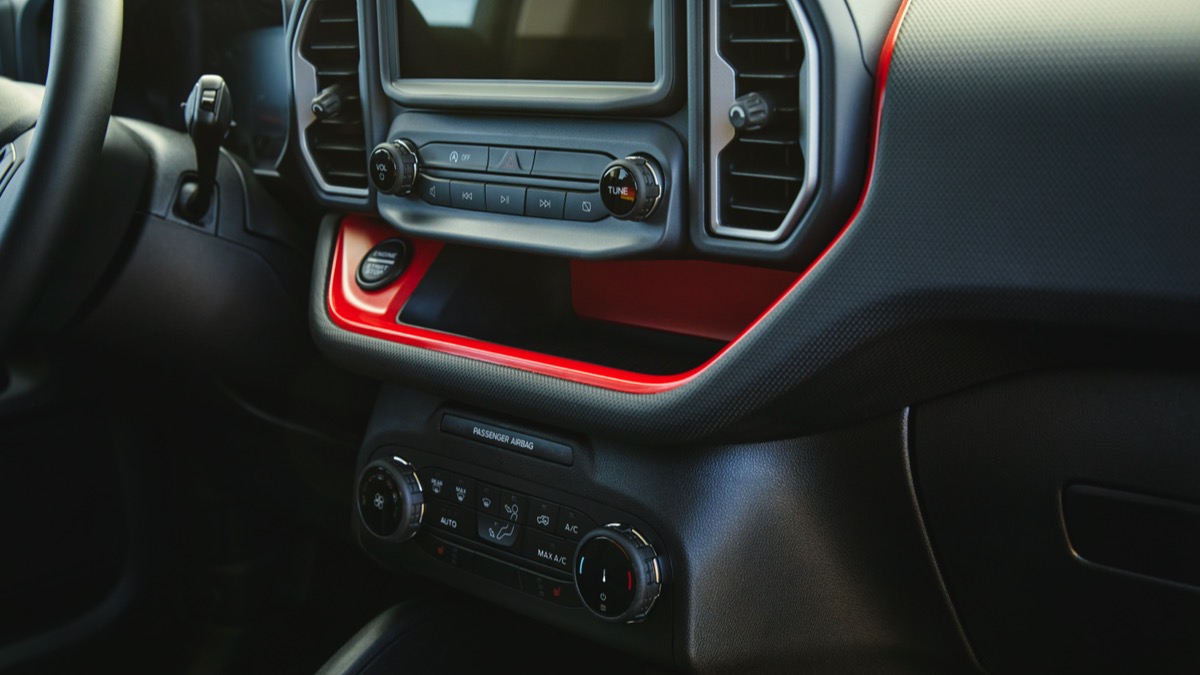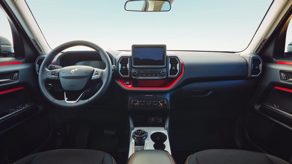 Bronco Sport Free Wheeling special edition also adds a silver-painted grille with two-tone Bronco badging and a modified lower front end insert. Rounding out the exterior changes are a Shadow Black roof and 17-inch high-gloss black wheels with red accents.
