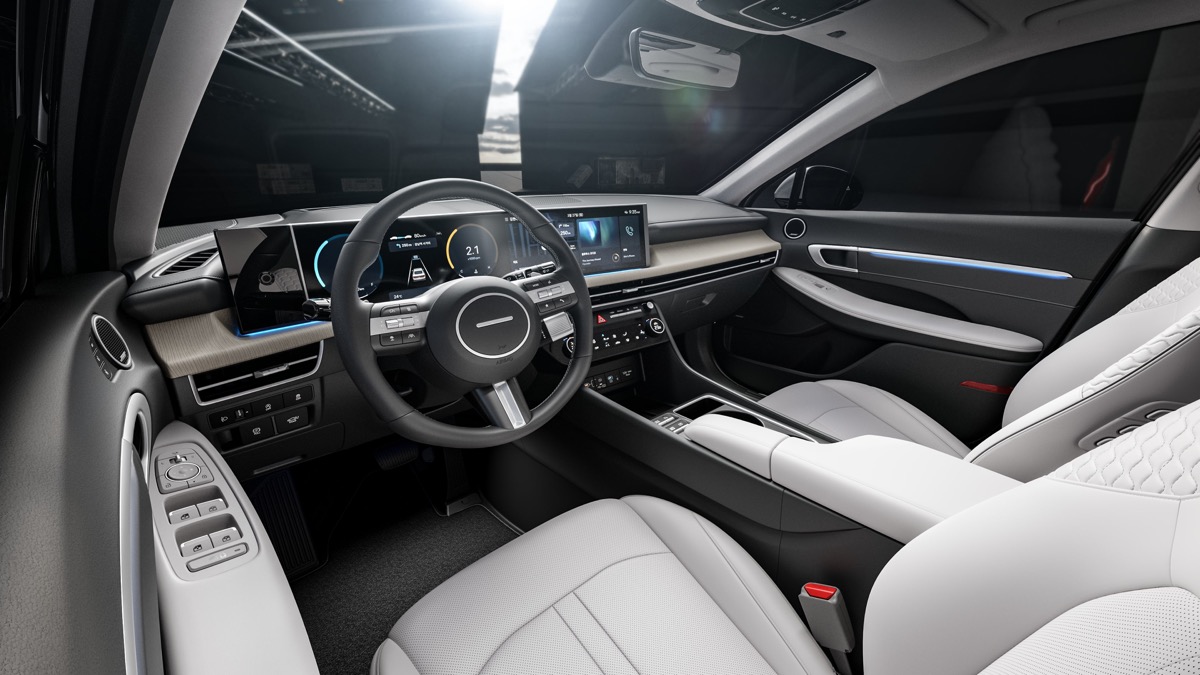 Inside, the new Sonata’s dashboard was almost fully redesigned, now with a more driver-centric approach matching the sportier exterior. It was also equipped with Hyundai’s new “Panoramic Curved Display,” essentially a dual 12.3-inch curved display hosting the infotainment screen and digital gauge cluster. Moreover, the manufacturer chose to go with a new twist-to-select gear selector on the steering column to free up some space on the center console.