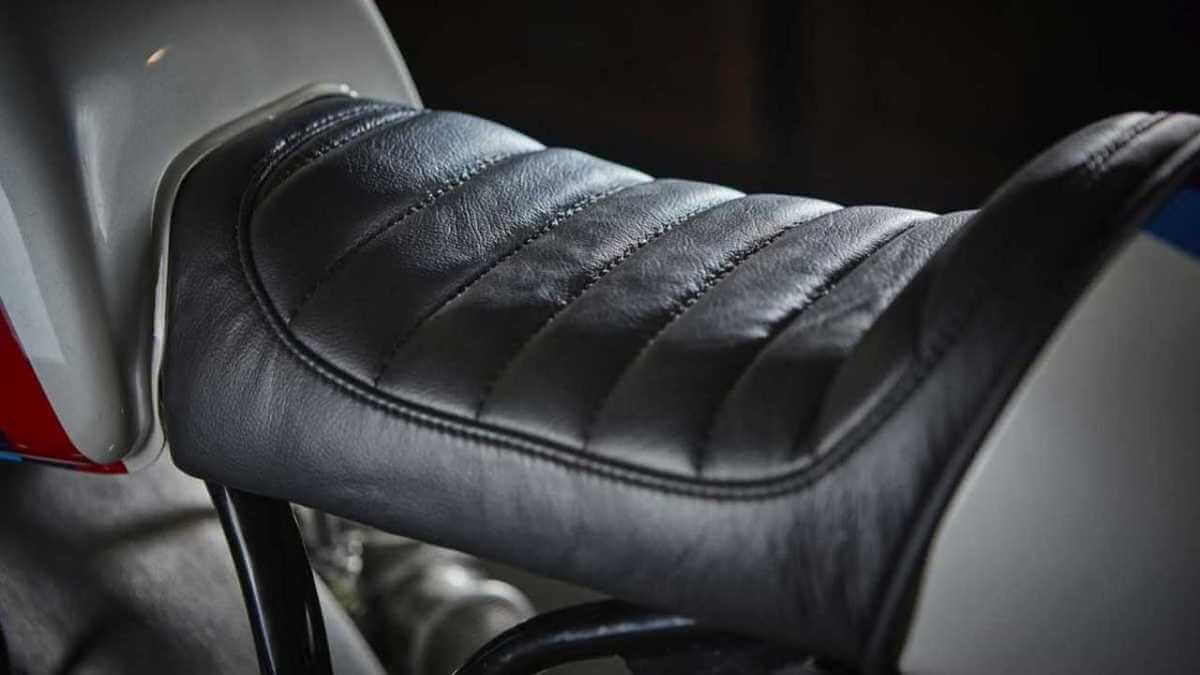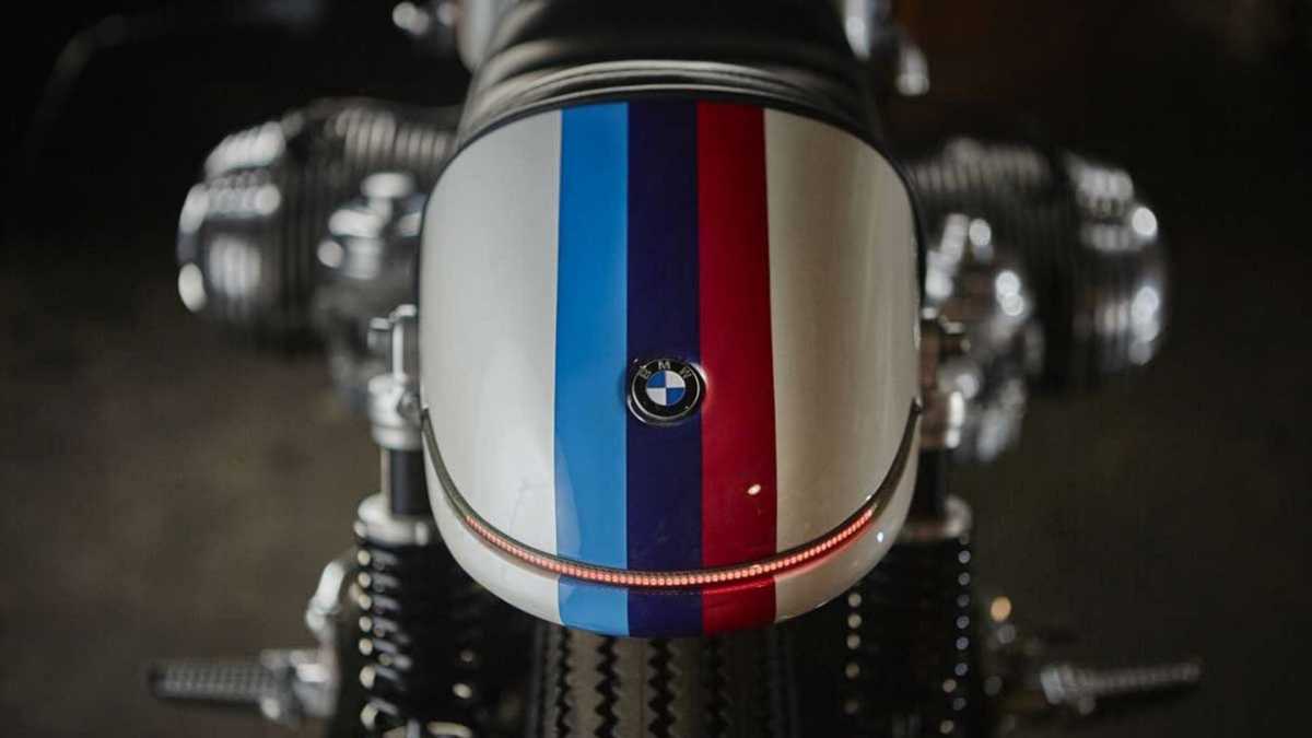 Staying true to the café racer body style, the stock fuel tank was raised to fit the custom subframe and match the rear cowl. Topping off the look is a custom-made all-black leather seat with BMW Rennsport stripes on the tank and the cowl.