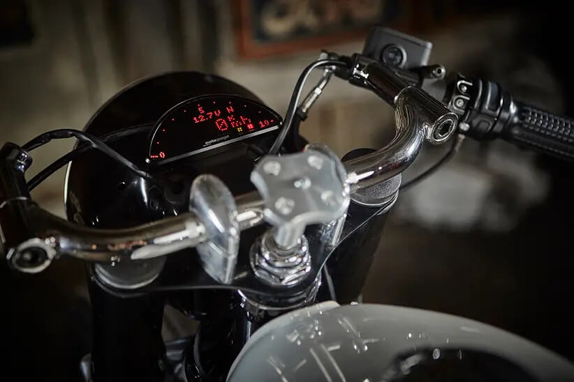 The R100 RT’s stock oil pump gave way to an aftermarket deep sump oil pan. At the same time, wires and electrical equipment were cleverly hidden with the aid of Motogadget’s custom-designed wiring harnesses and gizmos. All these changes bumped the power from 65hp to 70hp.