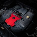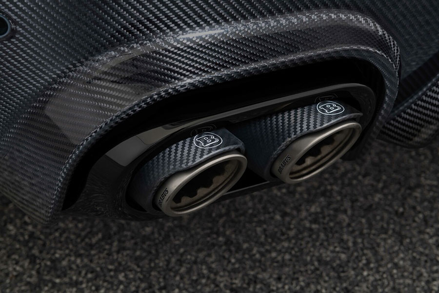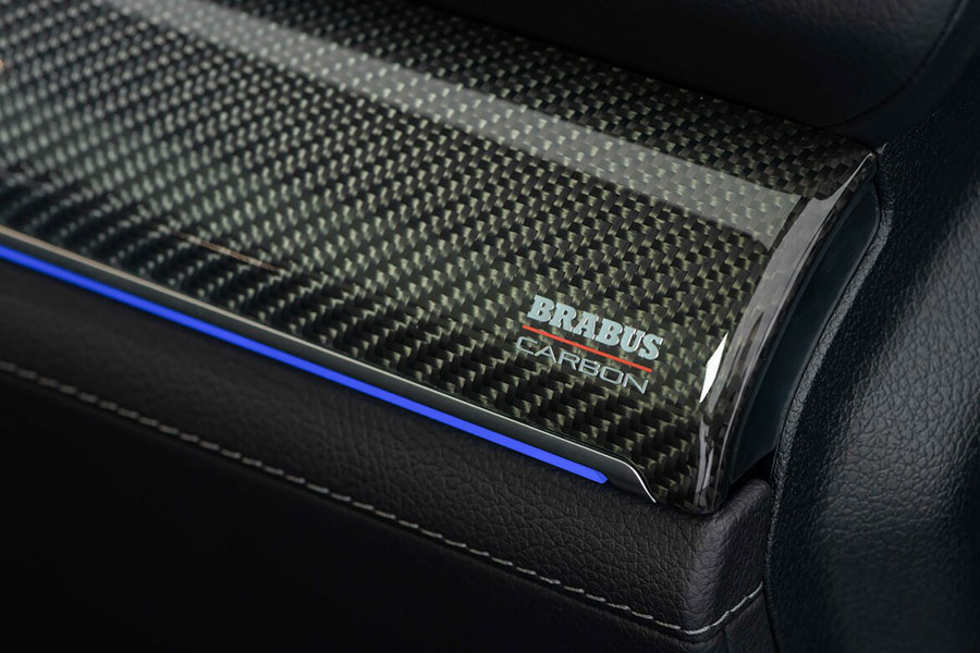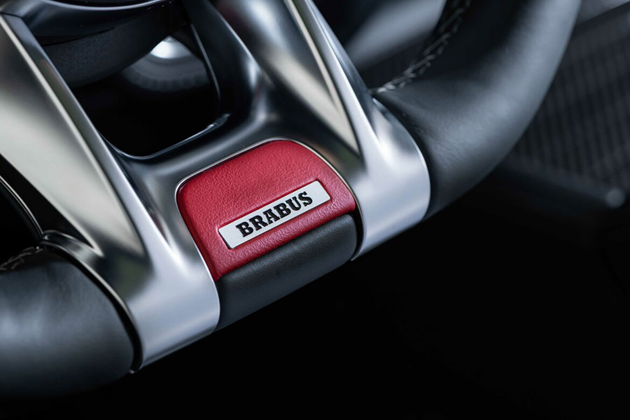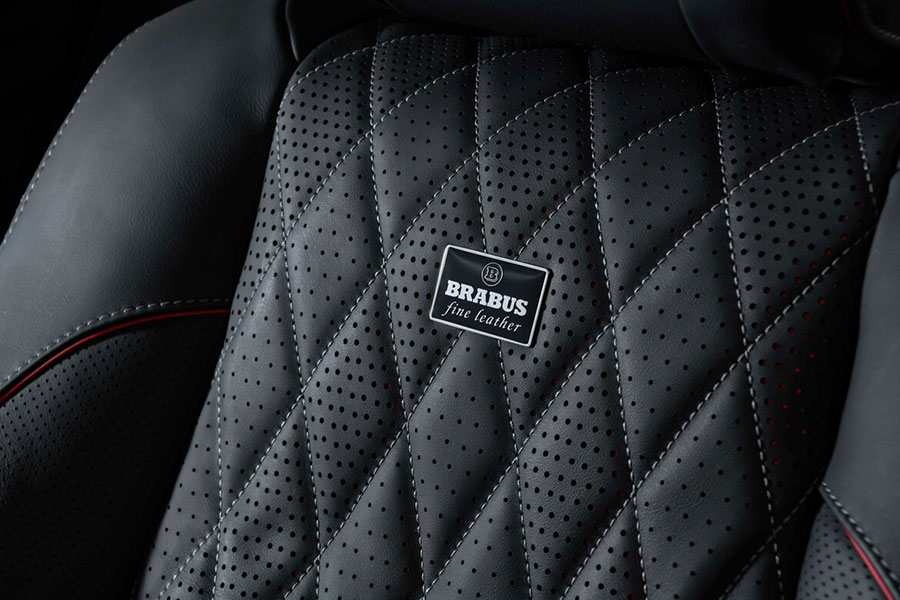 Furthermore, the cabin flaunts plush black leather upholstery and grey stitching with Brabus Arrow Wave quilted pattern. Exposed carbon fiber elements and red trim accents are also present throughout the interior.