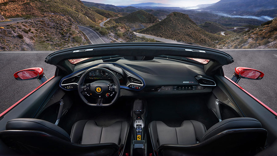 Of course, the crown jewel of the 296 GTS is the V6 hybrid. Indicative of its name, the Spider features Ferrari’s newest 2.9-liter twin-turbo V6 and a single electric motor powering the rear wheels. The combined output amounts to a whopping 819 hp, with over 670 horses from the V6 and 135 hp from the motor. However, what sets it apart from other conventional V6 engines is its character and throttle response.
