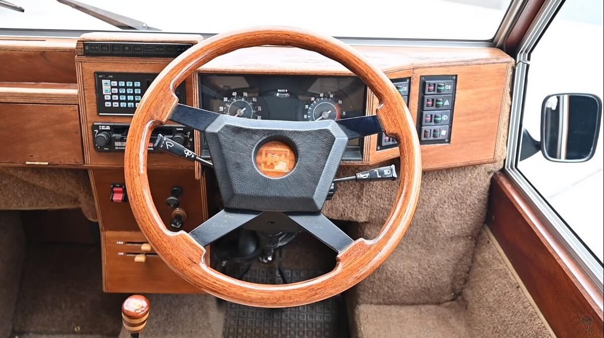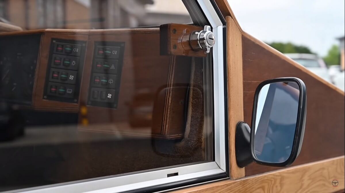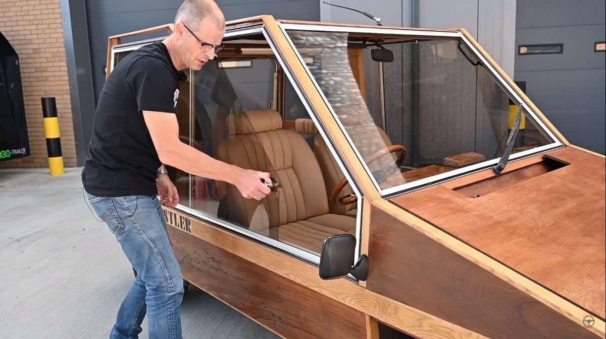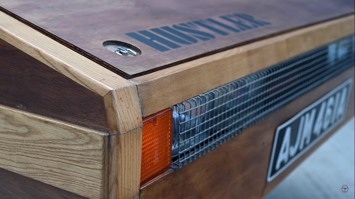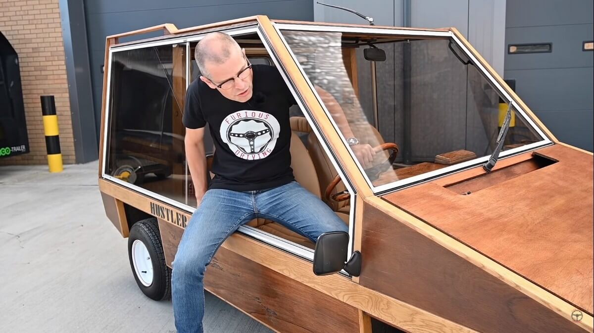 Of course, the Hustler 4 has somewhat of a boxy design. It’s a kit car entirely made of marine plywood, after all. Everything from the wheels to the pillars, dashboard, floors- all of that is made up of wood. Even the gear shift knob is wooden.