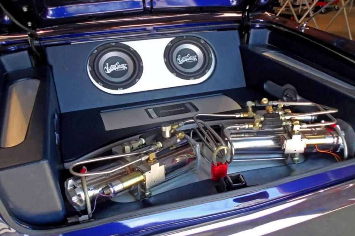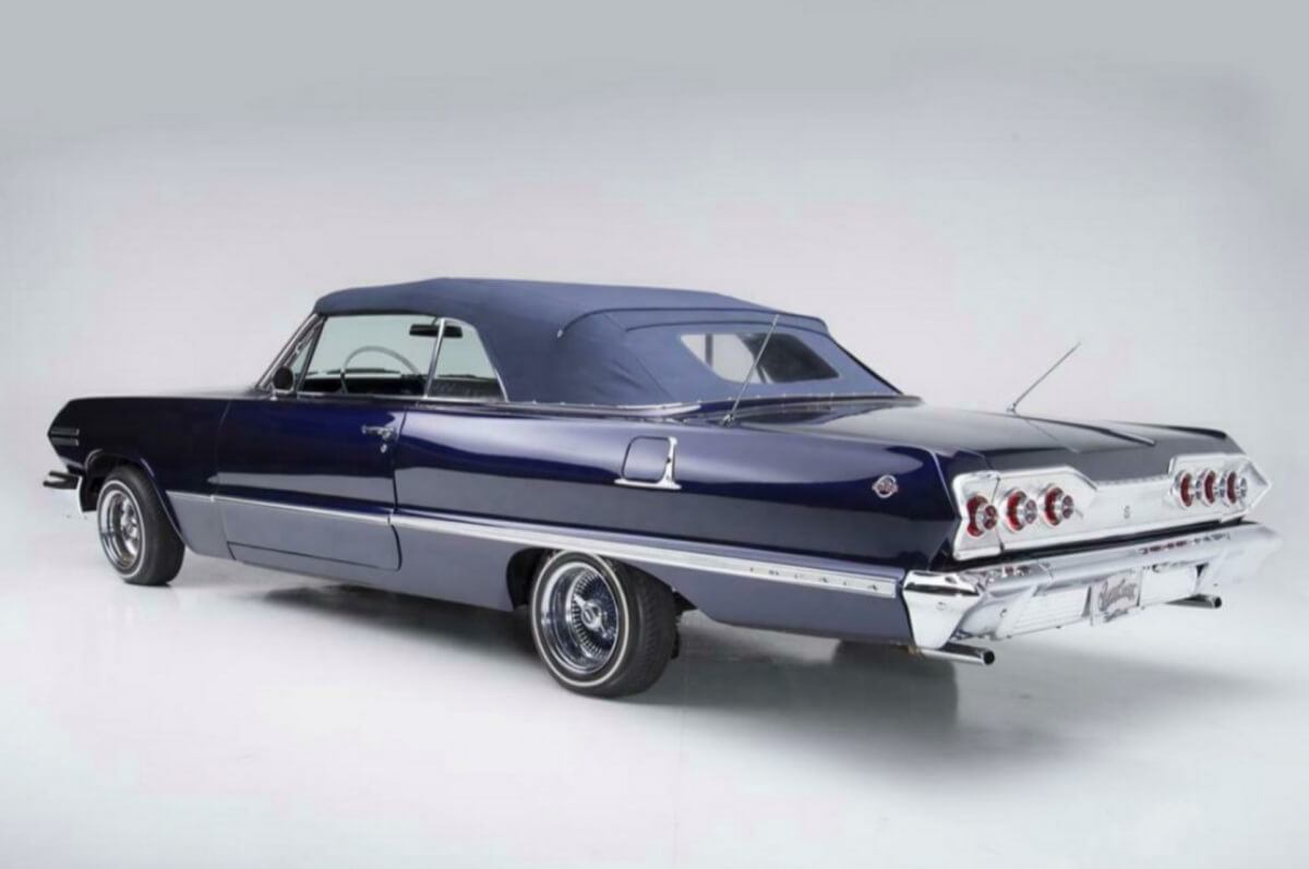 The car originally featured a 327 V8 engine. It has now been improved with hydraulics and various aftermarket parts. The exterior is painted in a unique shade somewhere between purple and royal blue. And years later, the shine is still impeccable.