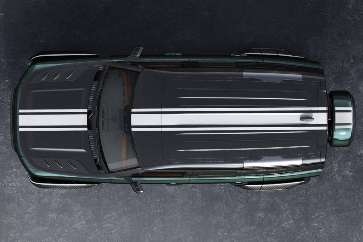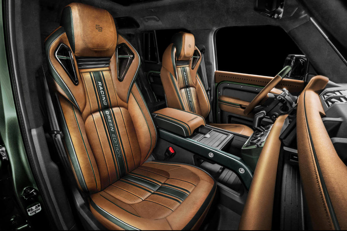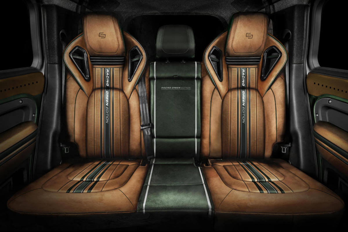 As the name suggests, the reshaped Land Rover Defender has been painted in deep green paint inspired by the legendary British Racing Green color, which was then brushed by hand to give the body a rustic look.