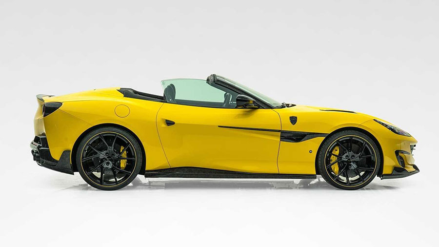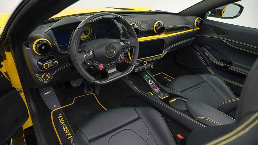 Moving inside, the Mansory Portofino adorns an eye-catchy black & yellow theme highlighted by black leather upholstery with contrast yellow stitching to go with the exterior. Yellow accents are used all around the interior, including the switches, knobs, and air vents. Meanwhile, the three buttons for the gearbox proudly represent the colors of the Italian Flag, although the Mansory logo replaces the Ferrari Prancing Horse on the steering wheel.