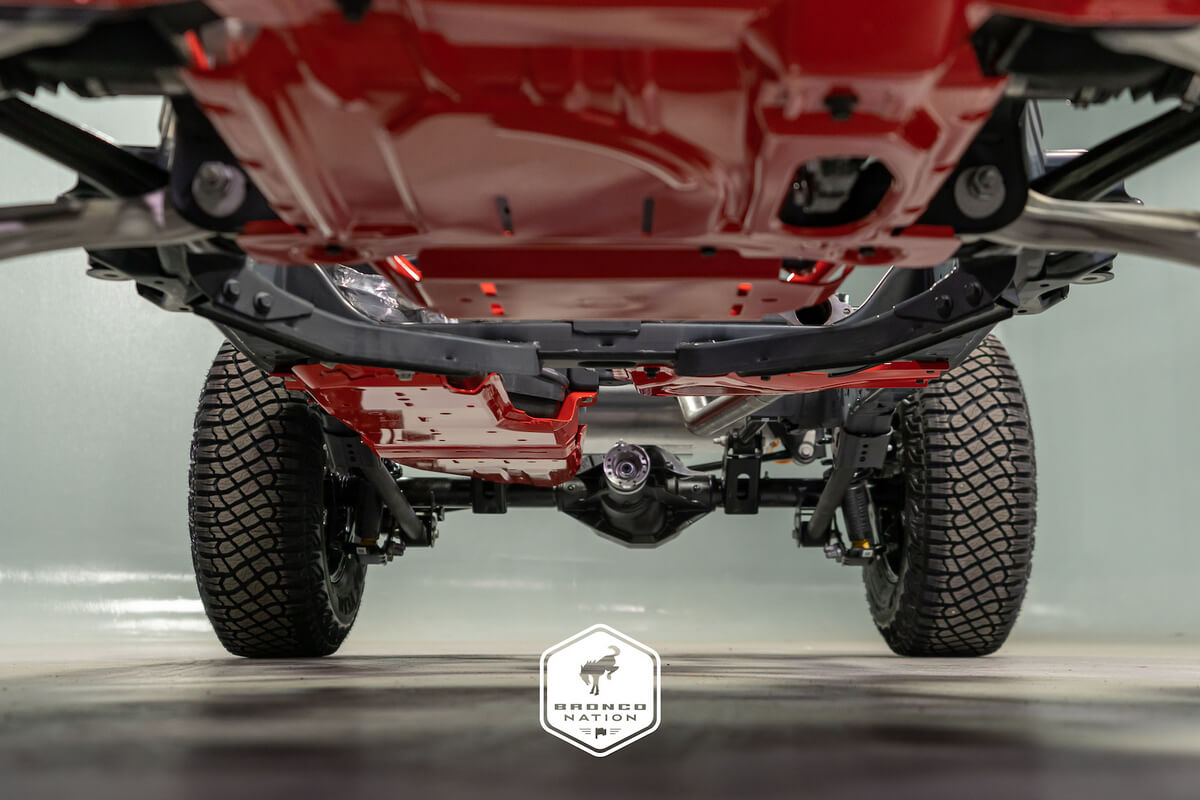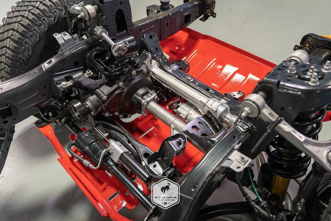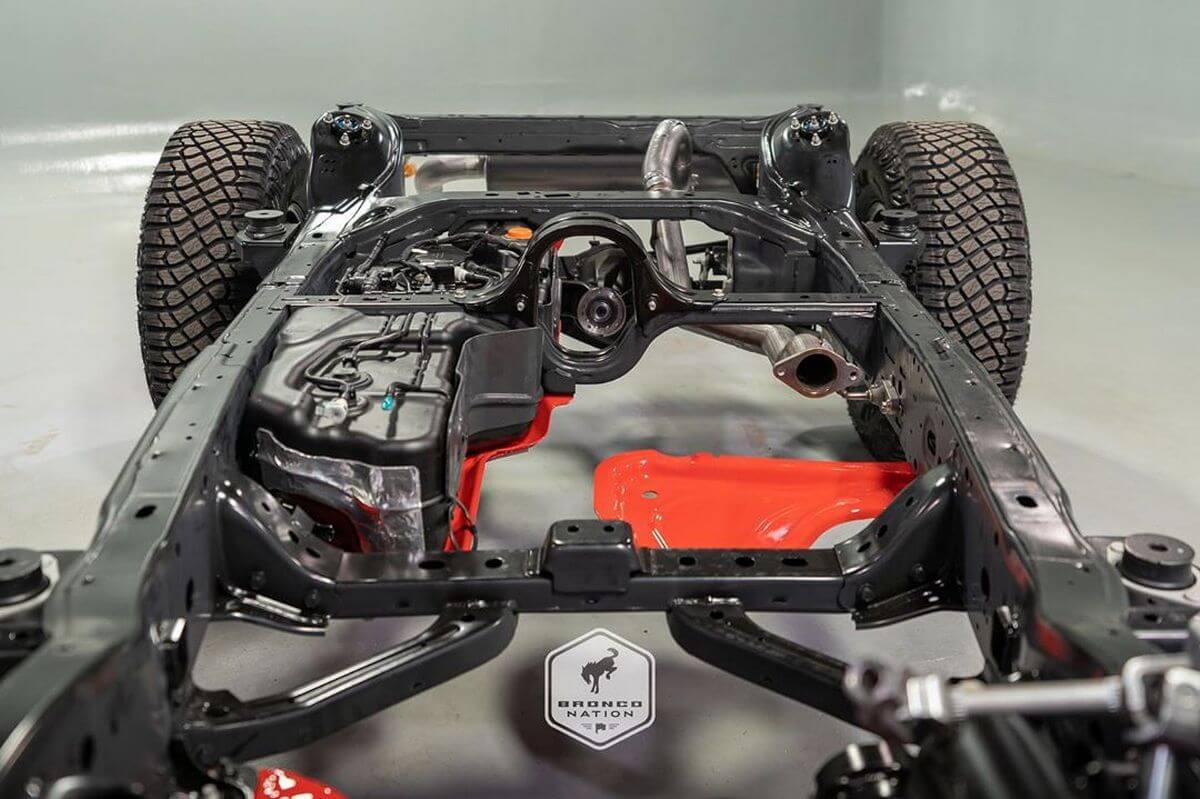 Right off the bat, we can see that the frame allows for a full-width cabin. Also, we have an exact look at the independent front suspension, which makes the Bronco more comfortable than its rivals.