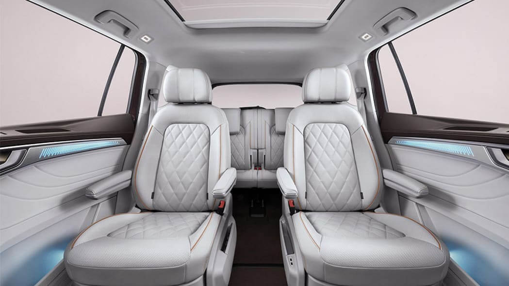 The Talagon’s interior is quite similar to what we find inside the Volkswagen ID.4—a large touchscreen infotainment system, a digital instrument display panel, and a three-spoke steering wheel flanked with tactile push buttons grace the cabin. And worth mentioning, the large sprawling sunroof combined with the above elements provide a refreshing and serene look to the car, unseen in many SUVs in the segment.